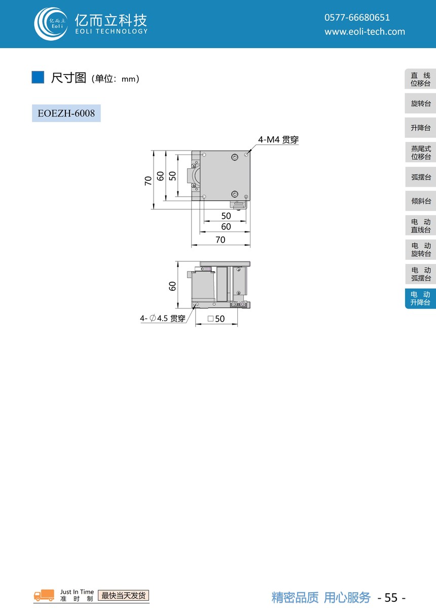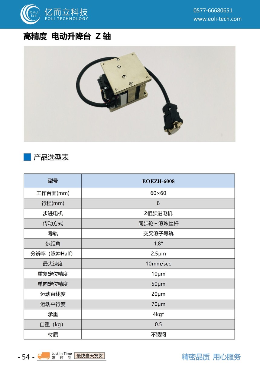 1. 采用同步轮、滚珠丝杆和交叉滚子导轨驱动,可实现高精度、平滑的移动。